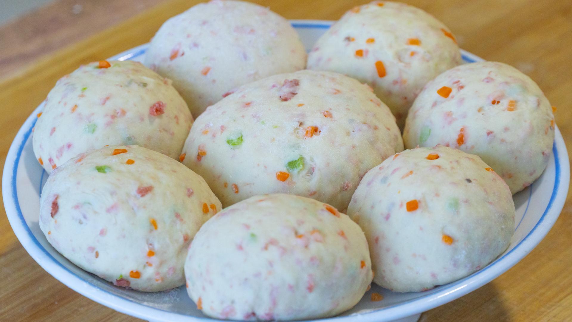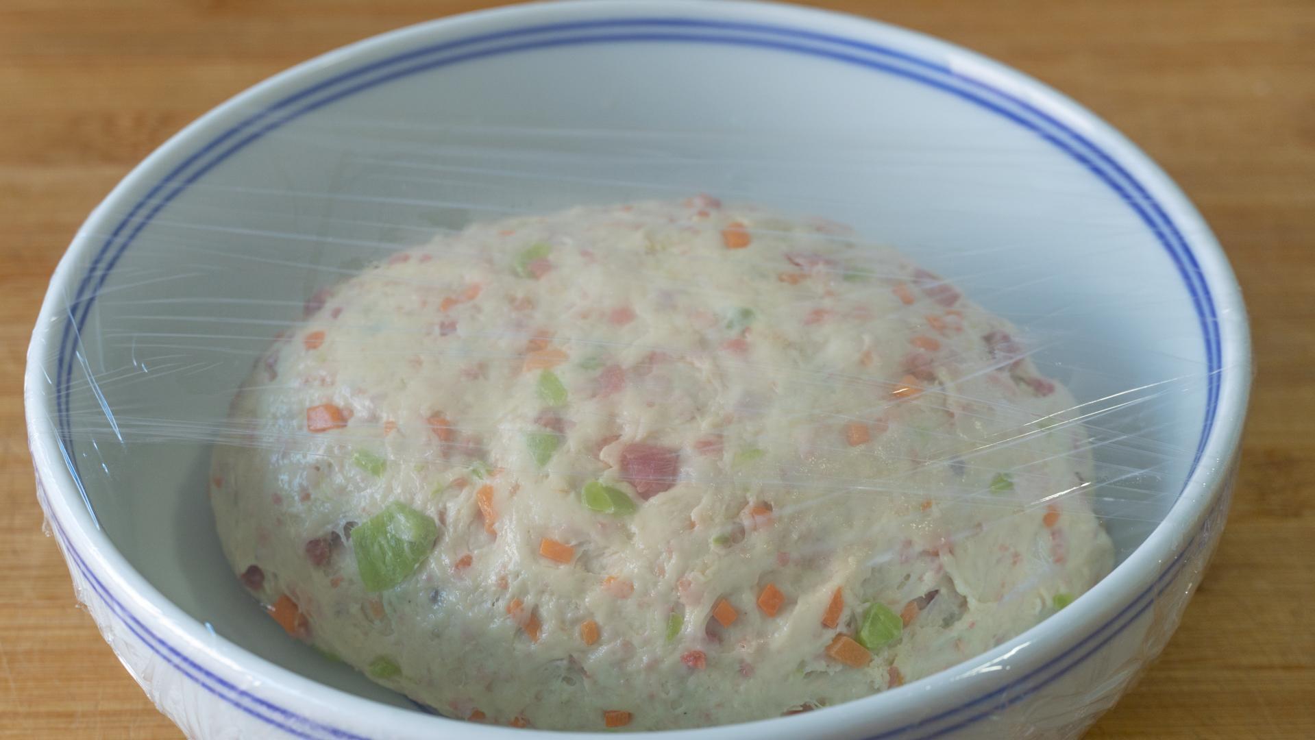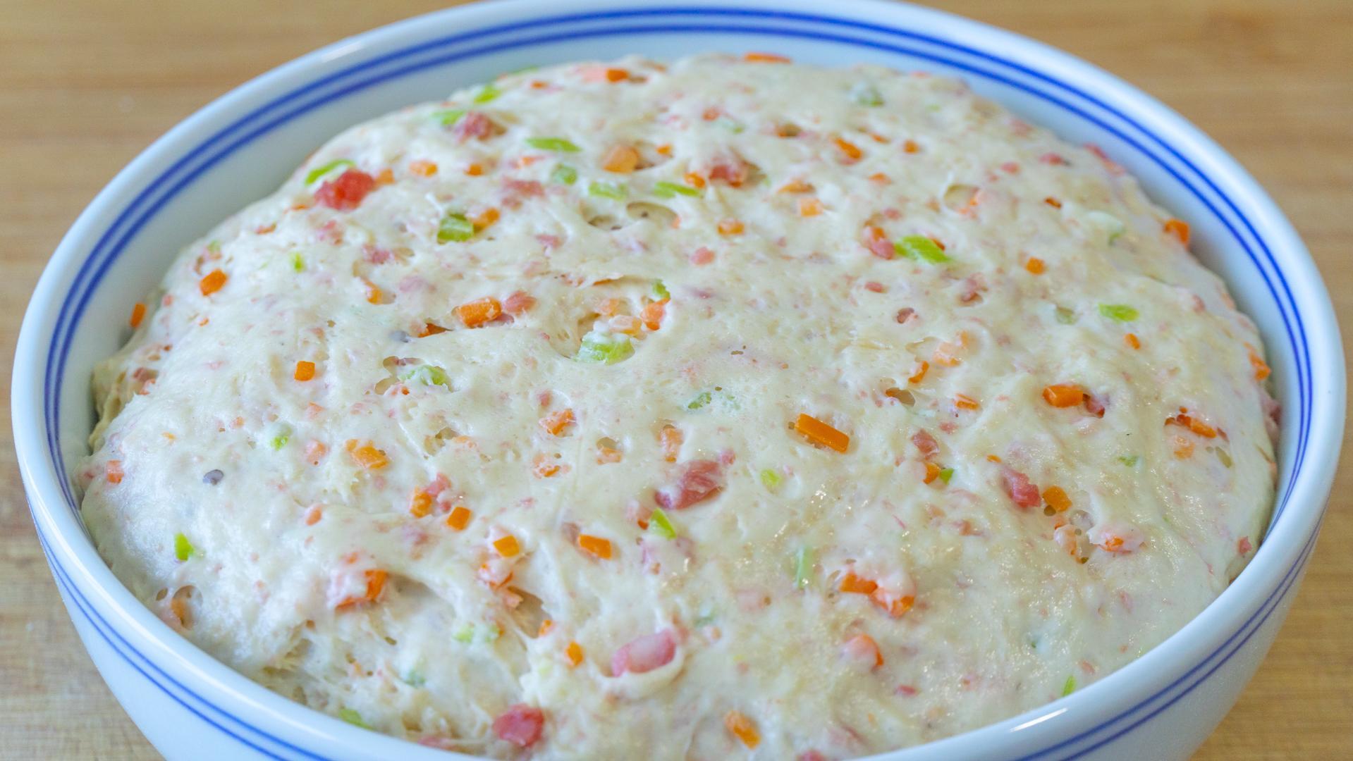 2、碗中加400克麪粉、5克酵母 、2克糖拌勻後再把青椒、胡蘿蔔、香腸都加進來。