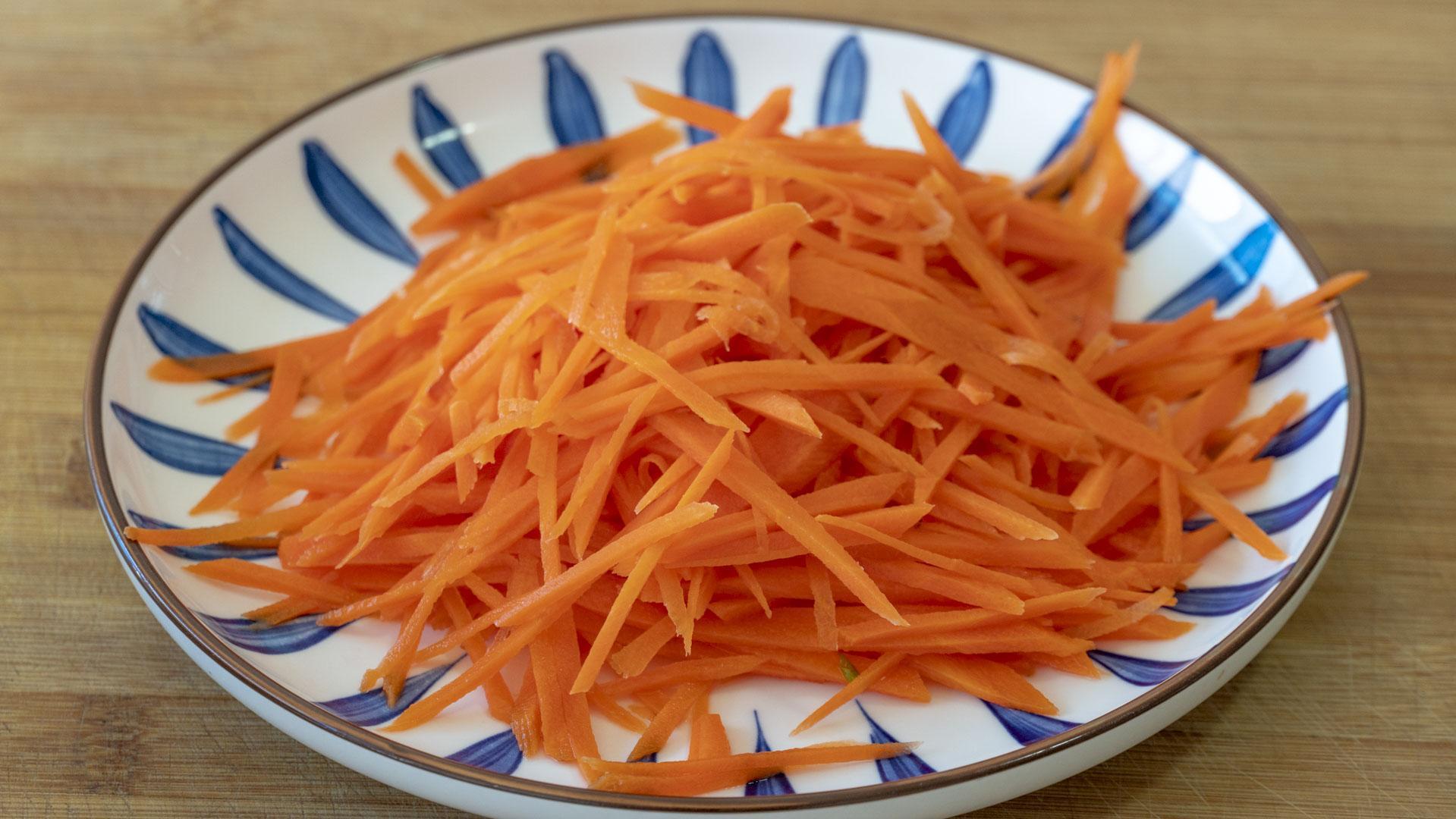 8、再把胡蘿蔔也倒進來焯下水,斷生後撈出來。