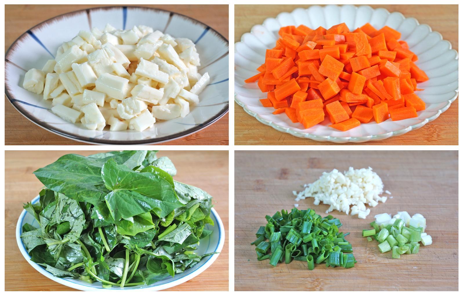 2、胡蘿蔔一根,洗淨去皮後切厚片,再切成小丁備用;紅薯葉一把,清洗乾淨後改刀切小段兒。