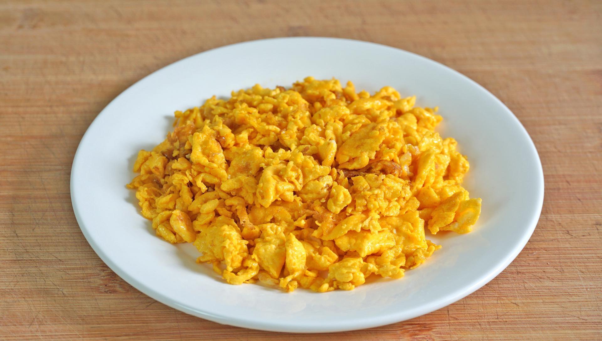 3、碗裏打入3個雞蛋,攪勻後煎成雞蛋碎,有點焦焦的後關火盛出來。