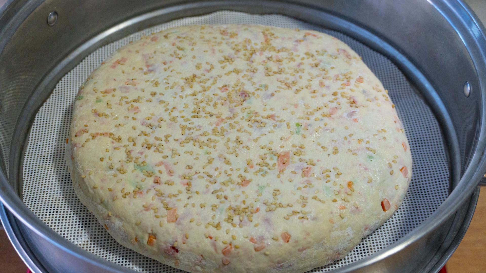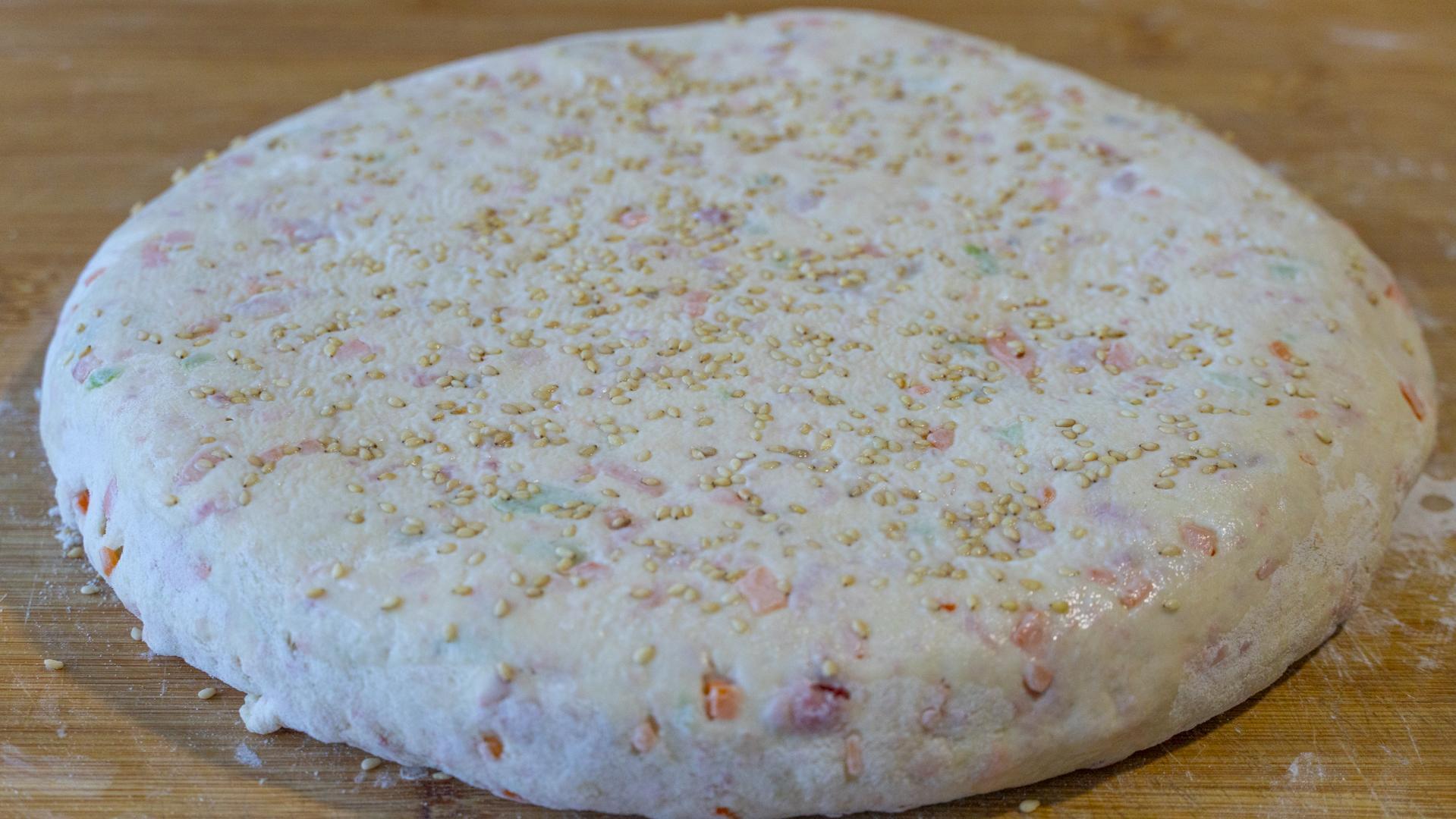 8、最後在第一張麪餅的邊緣上刷一層清水,然後再把它拉起來包裹住其他的小麪餅,底部不用封口,邊緣能包裹住就可以了。做好後翻面,表面刷點清水後再撒上白芝麻,再用擀麪杖輕輕擀緊實一些。