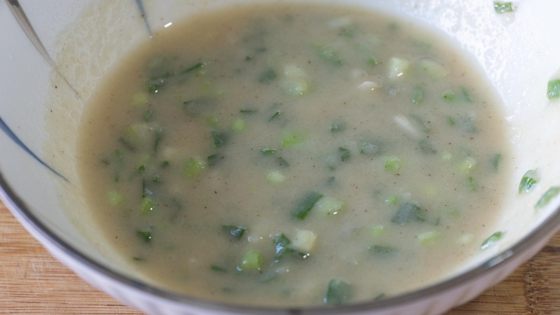 4、醒面的時間我們來做個油酥,麪粉、鹽、十三香、蔥花、熱油,攪拌均勻就可以了。