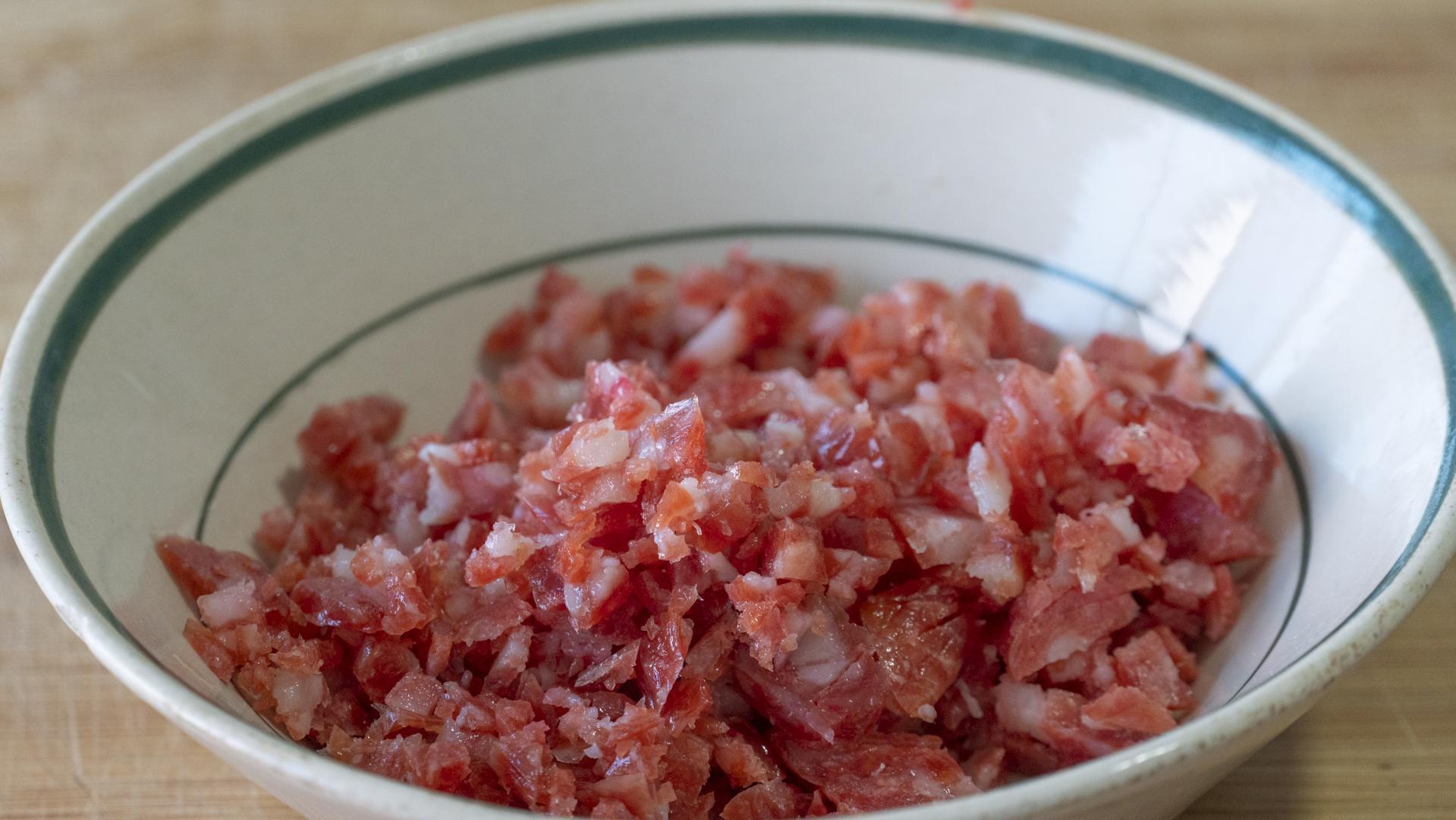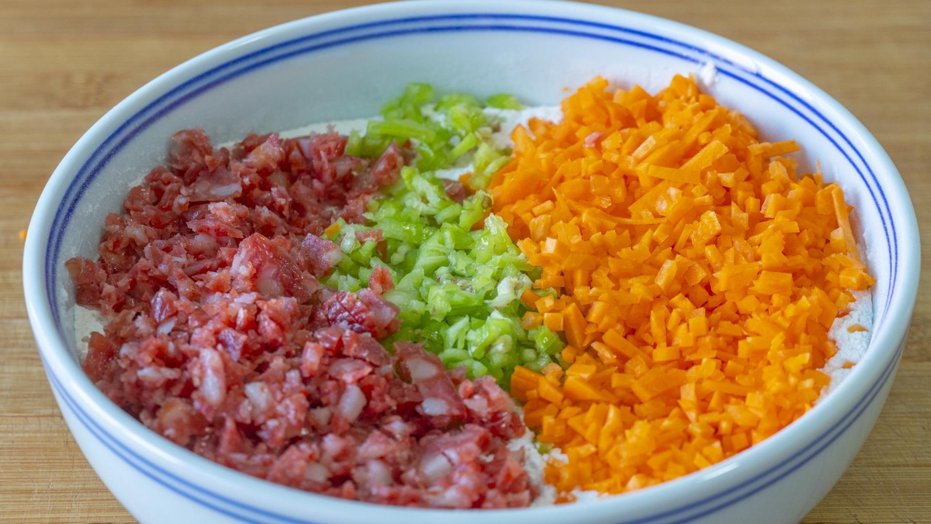 1、香腸1根切小丁;青椒一個切成小丁;小蔥1把切成蔥花;胡蘿蔔一根切成小丁備用。
