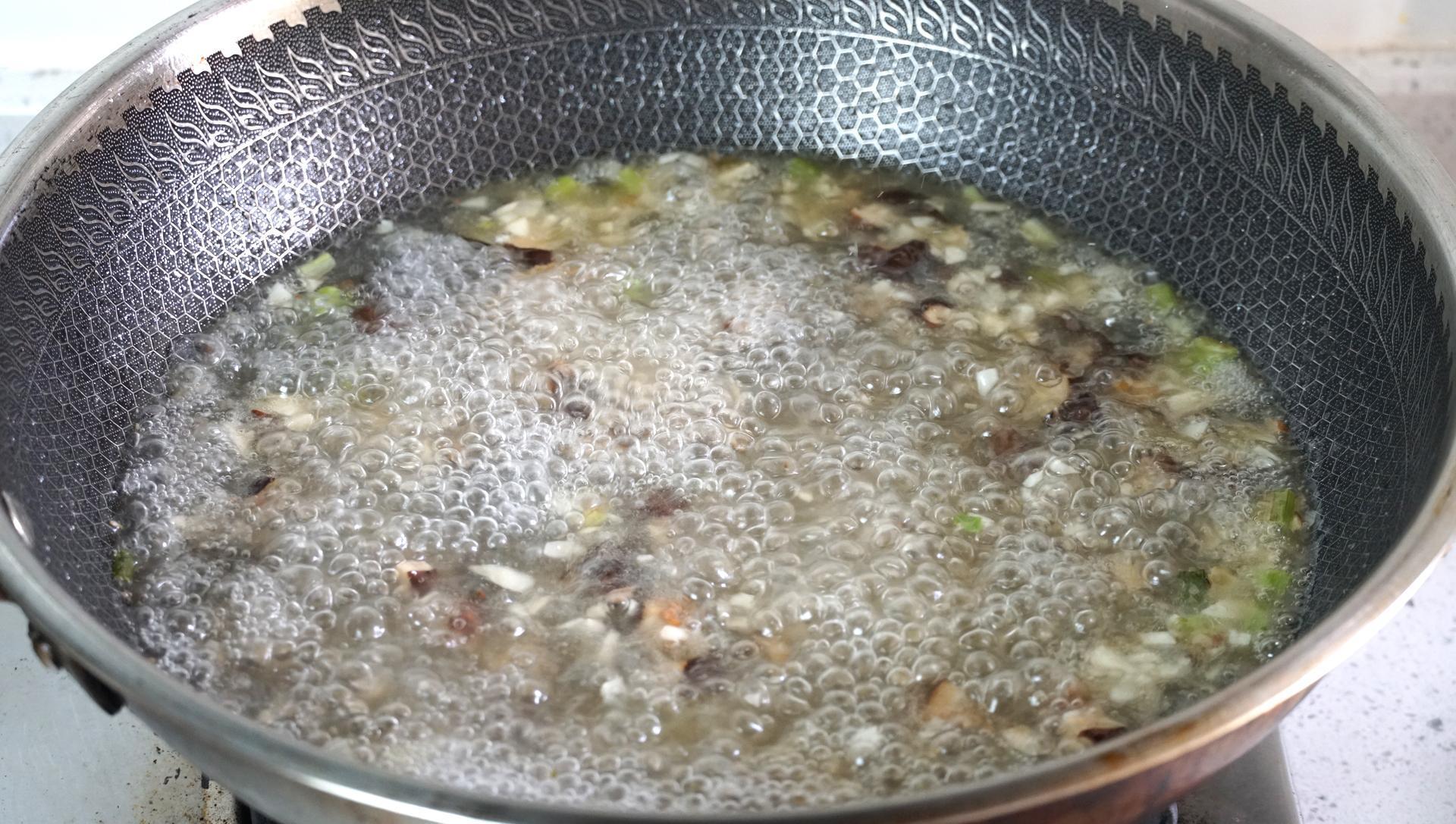 4、熱油下蒜末和蔥白爆香,接着把香菇倒進來炒一炒,把香菇水倒進來,然後再加半碗清水。