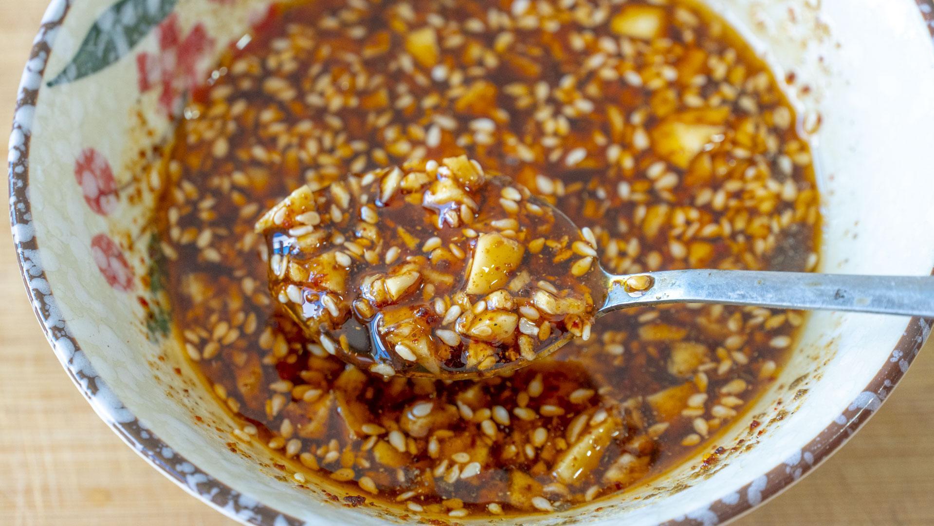 10、再來調個醬汁:白芝麻、蒜末、熱油、生抽、香醋、辣椒油、鹽、糖。