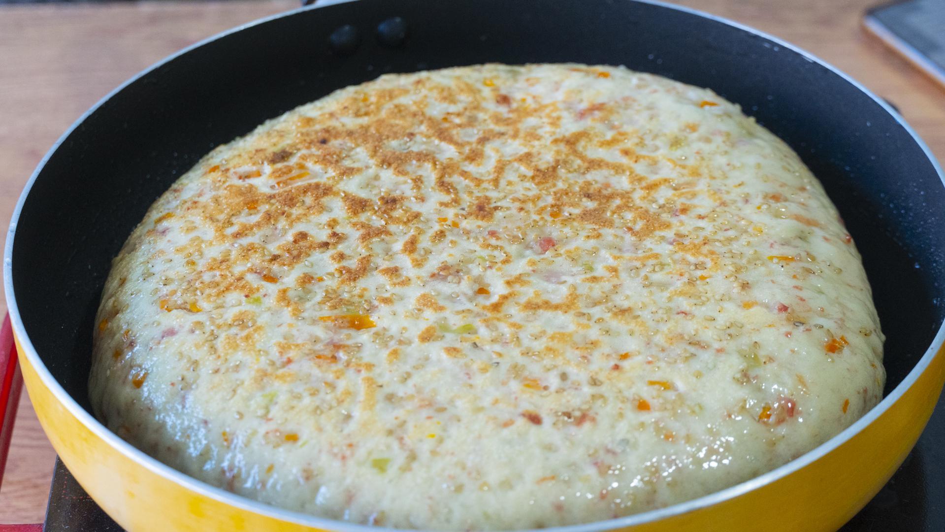 11、平底鍋預熱刷油,放入麪餅,煎至一面金黃後再翻面,兩面都煎得金黃焦脆後就可以出鍋了,這樣喫起來會更香。