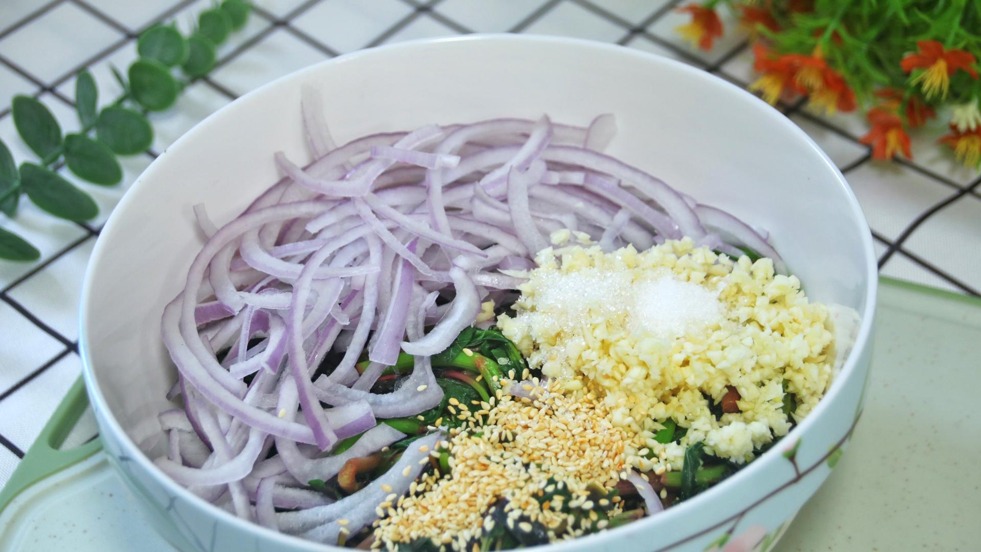 5、倒入洋蔥絲、蒜末、白芝麻 鹽 糖;燒開的熱油放入幹辣椒段,一起澆到蒜末上面;