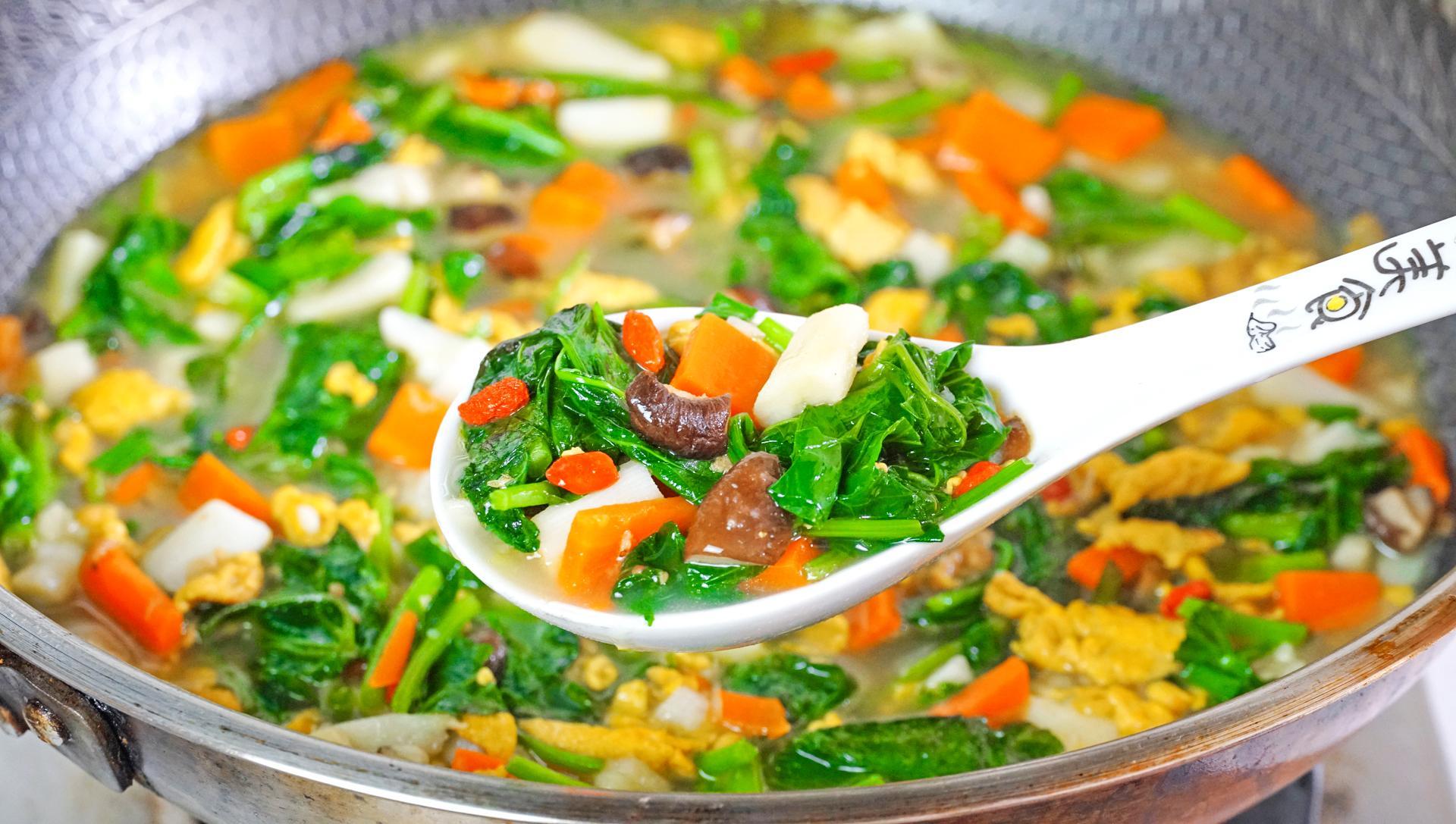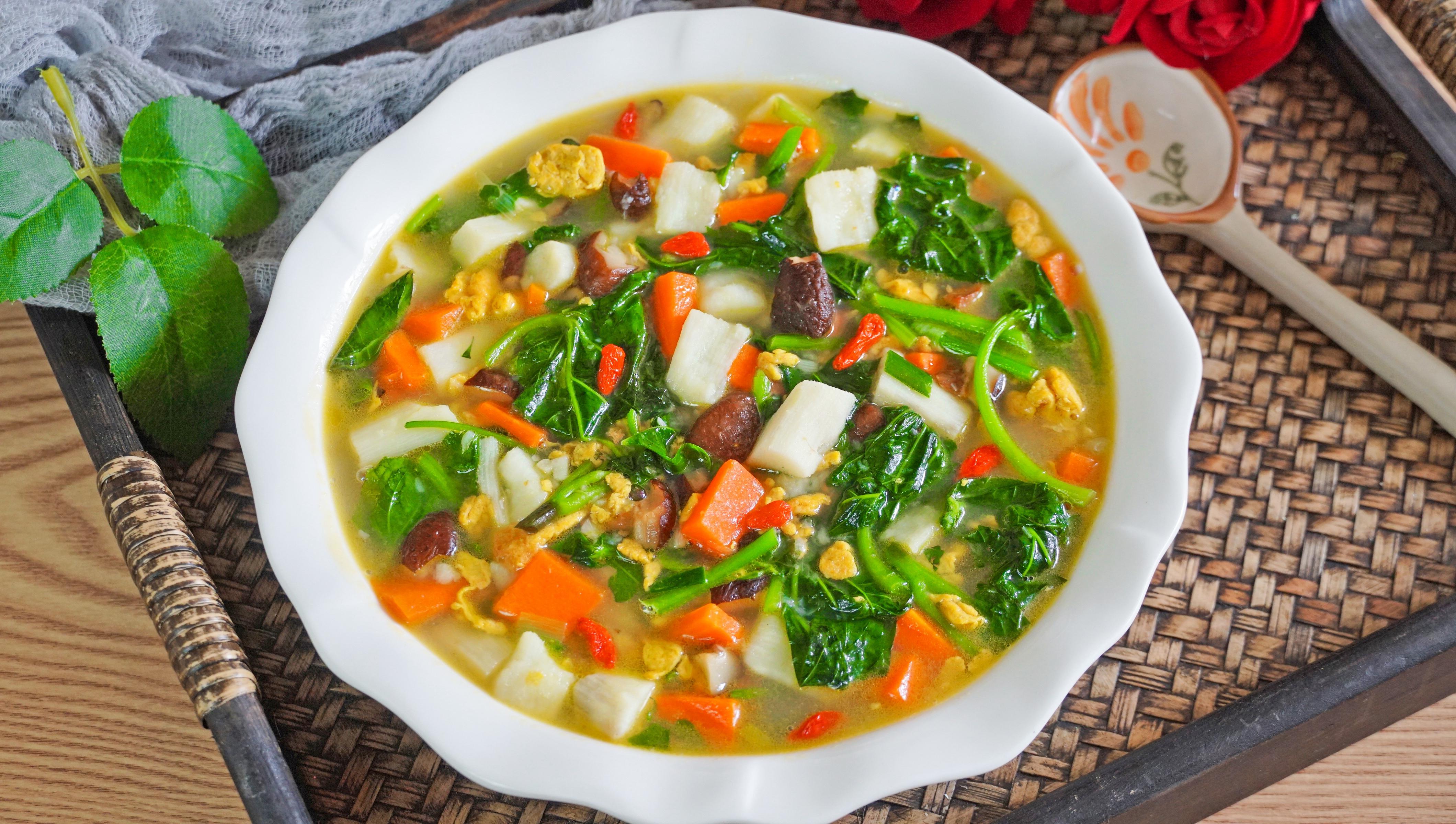 5、大火煮開後倒入山藥,胡蘿蔔,調味加鹽、雞精、生抽、一點點蠔油,然後蓋上繼續煮5分鐘。山藥和胡蘿蔔煮熟後再倒入雞蛋和青菜,繼續煮一分鐘就可以關火了。