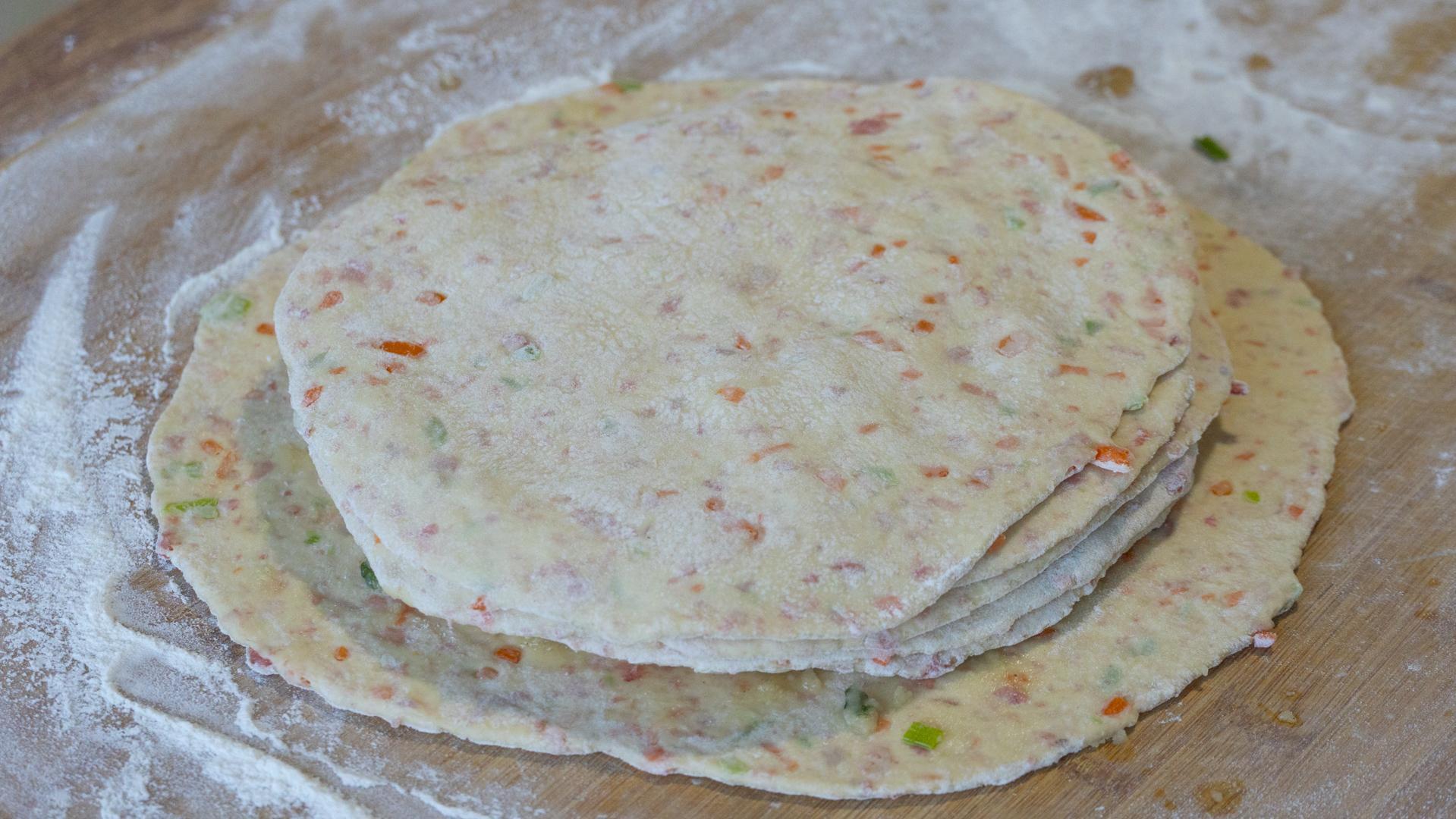 7、最後開始擀麪,擀開擀薄,也不用特別薄,大約跟硬幣的厚度差不多就可以了。全部擀好後把最大的麪餅放最下面,中間刷上油酥,然後放上第二張麪餅,繼續刷油酥,再放第三張,直到麪餅全部放完,最後一張不用刷油酥。