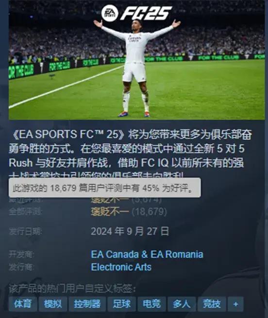 EA在今年9月份發售的《EA SPROTS FC 25》是這個經典系列的“年貨遊戲”,當然,它也具備了年貨的傳統特質,即“年年罵,年年買”——一經上線便登頂當月Steam銷量榜冠軍,然後點進遊戲一看,好評率只有45%。