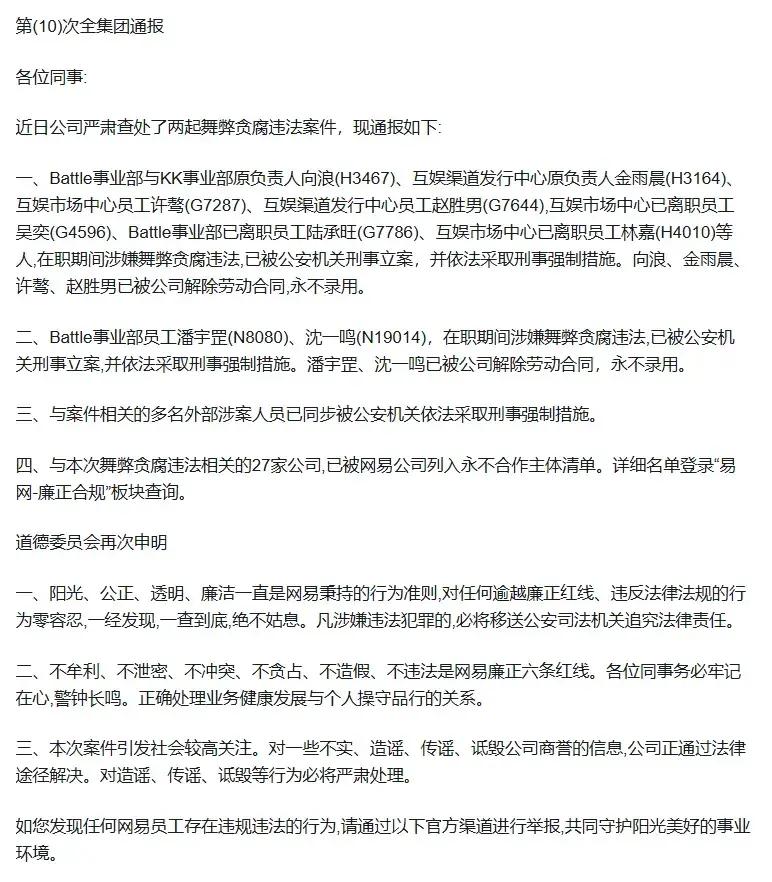 11月8日上午,網易集團內部發布郵件通報,通報了其遊戲業務多名高管及員工涉嫌貪腐案件的情況。通報稱,網易嚴肅查處了兩起舞弊貪腐違法案件,9名員工已被依法採取刑事強制措施;與本次舞弊貪腐違法相關的27家公司,已被網易公司列入永不合作主體清單。