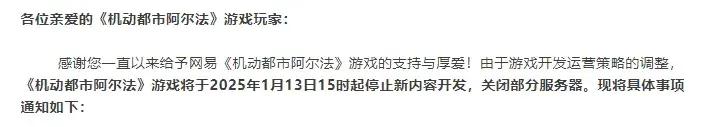 11月13日,網易旗下四款遊戲同步發佈停服公告,分別是網易自研的《機動都市阿爾法》與《泰亞史詩》,由檸檬遊戲工作室開發、網易代發行的《戰爭怒吼》,還有網易、寶可夢公司和GAME FREAK共同開發的《寶可夢大探險》。