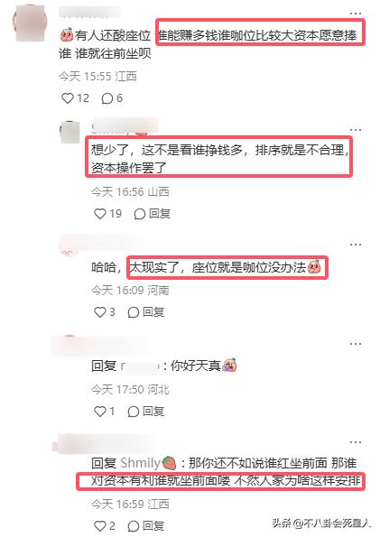 可回到內場,一張座位圖才真正暴露了他們各自的“內裏”,資源咖們齊齊亮相第一排,反倒是那些老戲骨、老藝術家們慘遭“甩尾”。