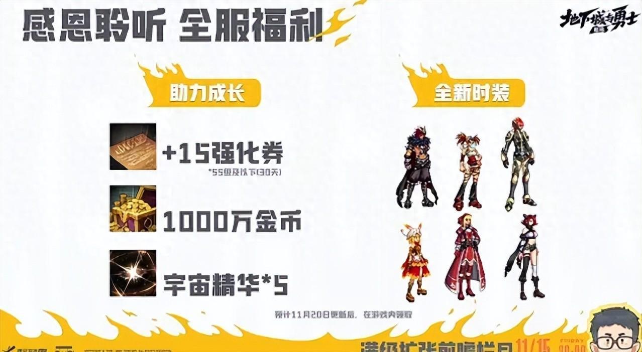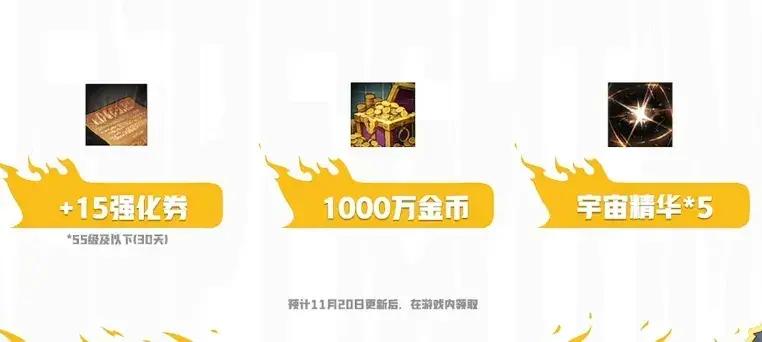 11.20更新後,全民可領取1張+15強化券、1000萬金幣、5個宇宙精華,以及1套全新時裝。