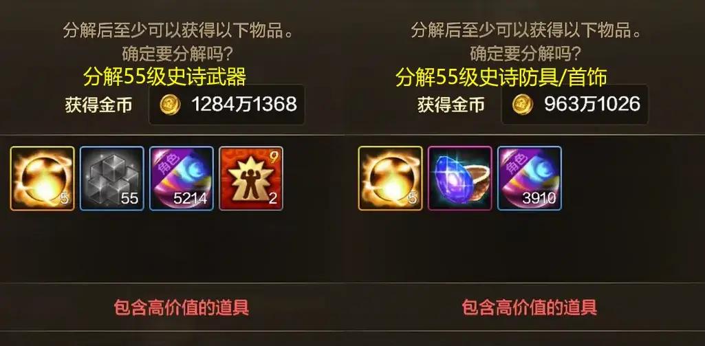 分解“55級史詩防具/首飾”,如浩海防具、深海首飾等,可以拿到3910個爐巖炭+1000萬金幣!