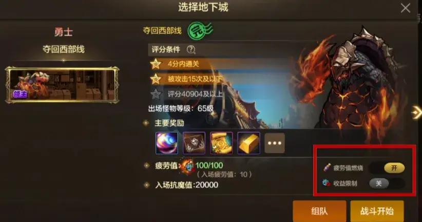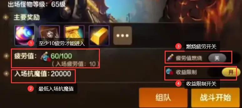 2萬抗魔值才能進入,每次進入消耗10疲勞值,如低於10疲勞值則無法進入!(開啓燃燒疲勞則爲消耗20疲勞值)