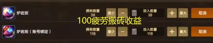 核心產出道具依舊是“爐巖炭”,100疲勞大概可以掉落150個左右爐巖炭!