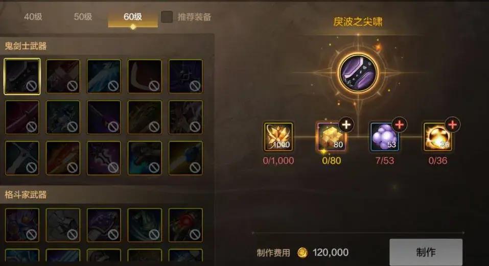 60級史詩同樣可以用史詩精粹製作,1000個精粹+80個金色+53個元素結晶+36個宇宙靈魂可製作1件武器!