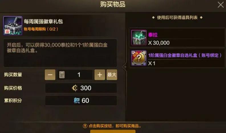 售價300點券,包含3萬泰拉+1個自選屬強徽章。