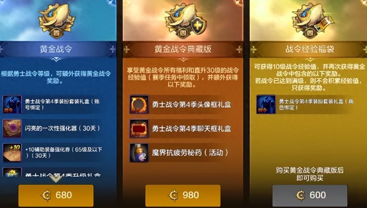 售價依舊分爲2個檔次:680點券黃金戰令,980點券黃金典藏戰令、加直升30級。