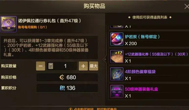 售價680點券,可以讓一個角色直升47級,這也是手遊中第一次推出“直升禮包”!