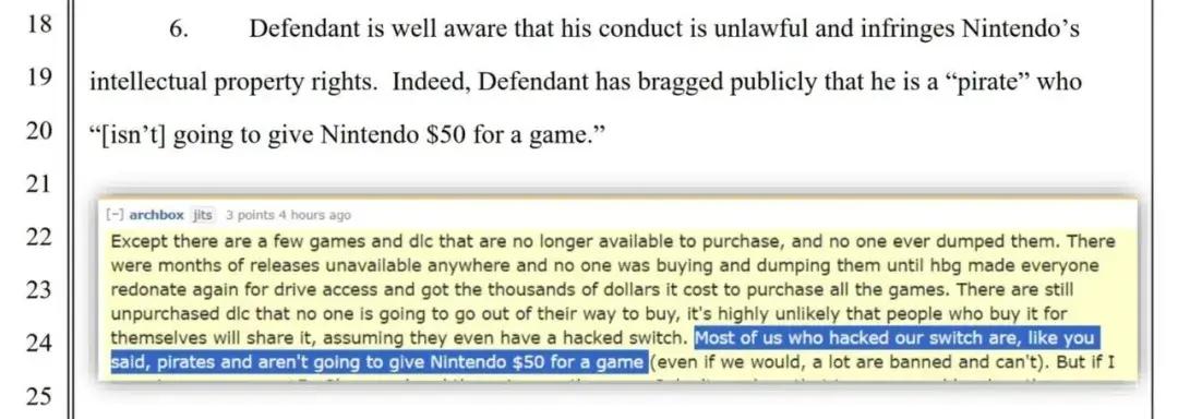 除此之外,任天堂還列舉了Reddit上Archbox發佈的各種消息,比如其公開吹噓自己是“真正的海盜”、“永遠不會花50美元購買一個任天堂遊戲”等等,以證明其具有主觀侵權意願。