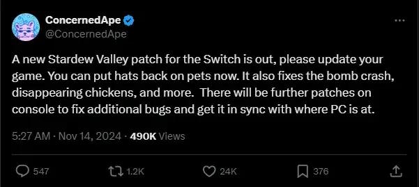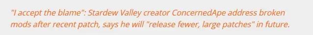 ConcernedApe接受批評並表示以後會減少補丁製作頻率,提高製作效率
