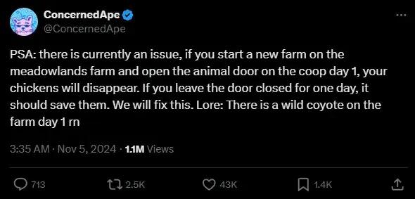 在這之前,玩家在多人模式的Meadowlands農場養雞時,如果在第一天忘記關閉雞舍的門,次日早晨會發現小雞全部消失。開發者ConcernedApe(本名Eric Barone)發推文解釋,這是因爲玩家沒關好門,所以“小雞被土狼偷走了”。