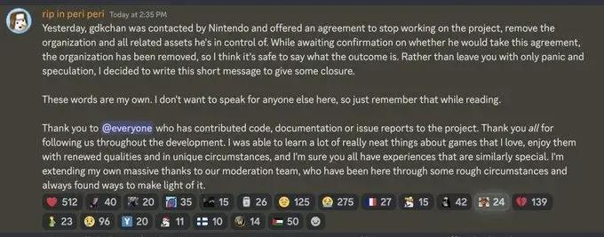 10月初,在毫無徵兆的情況下,Ryujinx的GitHub儲存庫被突然清空,Discord服務器也遭到鎖定。幾個小時後,一名Ryujinx開發團隊的成員才發出消息,稱“經過和任天堂聯繫,開發團隊同意停止繼續運營項目,並且會銷燬全部相關資產。”