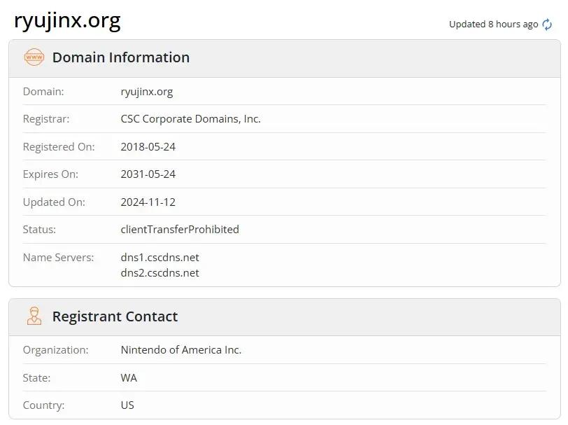 直到Ryujinx被關閉一個月後,事情又有了新進展。根據Whois數據庫的信息,11月7日,Ryujinx的域名註冊信息已悄然變更成了“任天堂美國”,而網站也已經完全無法打開。