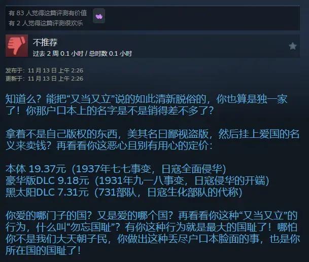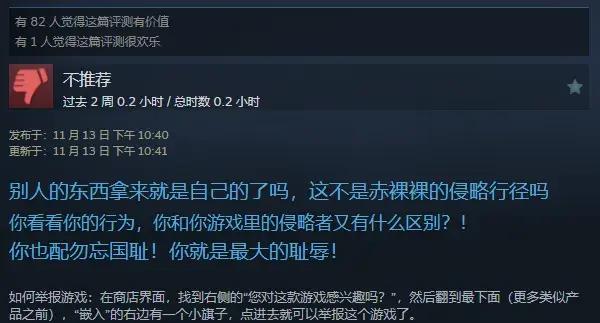 錯的是向Steam上傳這部遊戲的人,假冒遊戲開發者,還在“開發者”一欄爲自己冠以“勿忘國恥”和“China Game”的名號——隨即打着這些名號,拿不屬於自己的東西,向玩家們收取19.37元、9.18元或7.31元人民幣。
