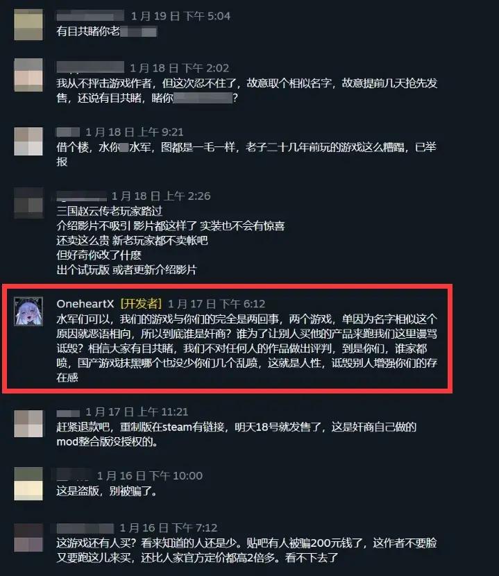 結果氣憤的玩家們都記住了回覆自己的那個暱稱:“OneheartX”。有網友爆料稱,這個人已經不是第一次充當李鬼了。另一部國產經典遊戲《趙雲傳》,也遭到了這個人的毒手。