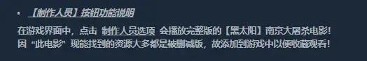 至於“黑太陽”,則是收錄了據稱“未刪減”的同名香港電影《黑太陽》系列,其中記錄了侵華日軍“731部隊”細菌戰的罪行,雖符合“抗日”主題,但跟遊戲本身毫無關聯;何況這些電影同樣也是未經授權上傳的。在遊戲主菜單,點擊“製作人員”選項會即刻播放這幾部《黑太陽》,倒是原本的製作組名單不知去向。