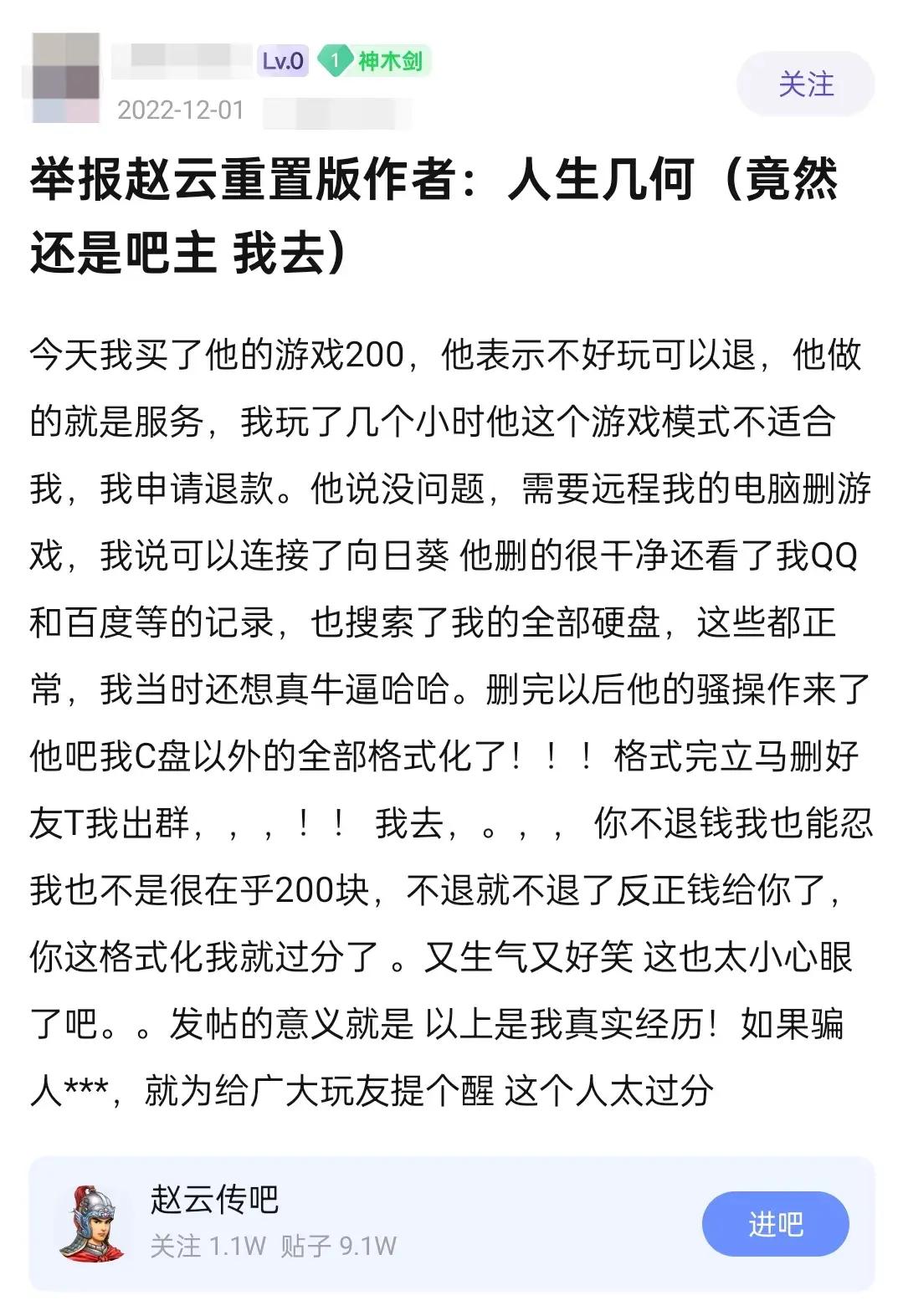 更有網友指認,此人正是百度貼吧《趙雲傳》吧前吧主,有着收費倒賣盜版《趙雲傳》整合包的前科;在任期間他還封殺其他模組作者、封鎖官方重製版的消息,在有玩家提出退款時,哄騙對方接受遠程控制,再將其電腦C盤格式化以示報復。