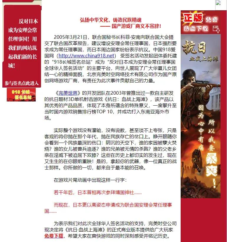 2005年3月,日本要求成爲聯合國安理會常任理事國,中國各地掀起反日浪潮。爲了支持這期間表達抗議的“全球華人簽名活動”,完美時空將《戰上海》的完整商業版本上傳,供廣大玩家免費下載。據報道記載,短短三天內,就有超過16.6萬人從網站下載了遊戲。