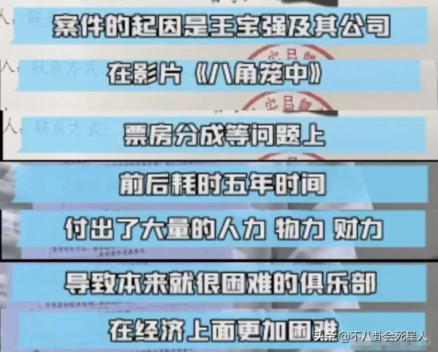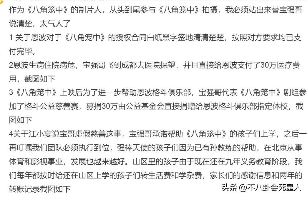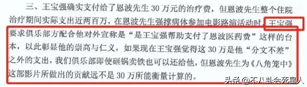後有《八角籠中》的製片人出面爲王寶強說話,首先說王寶強已經按照合同支付了答應給俱樂部的費用,然後俱樂部負責人進醫院的時候,王寶強還出了30萬醫藥費,最後,王寶強還給俱樂部捐了30萬元。