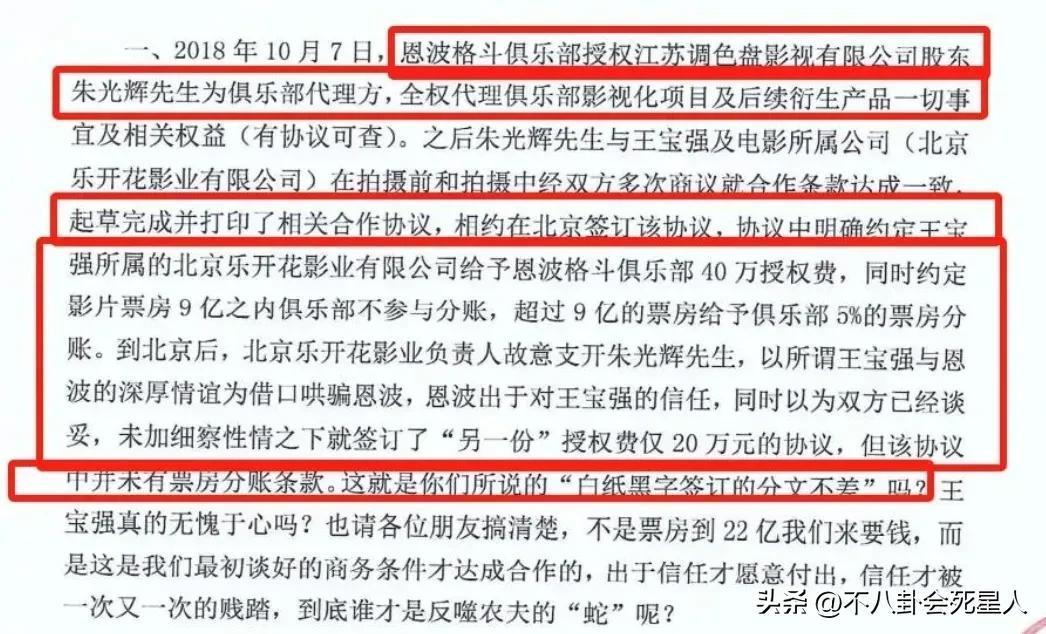 但後來王寶強的負責人以哄騙的方式讓俱樂部出於對王寶強的信任,跟他們簽訂了另一份沒有提到票房分成,而且只分20萬元授權費的合同。