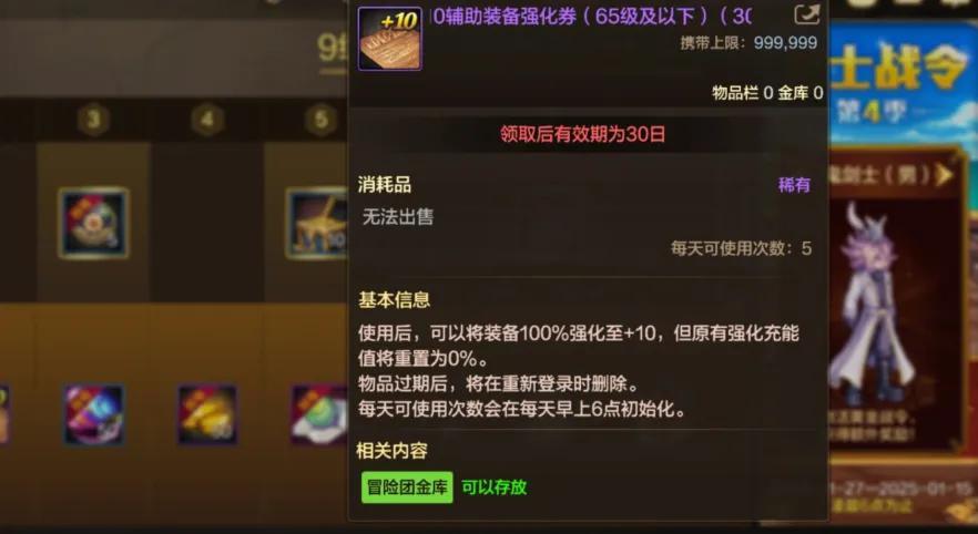 第三、黃金戰令升到2級,可以拿到一張+10輔助裝備強化券,可以先用強化券+10,然後再用強化器或爐巖炭!