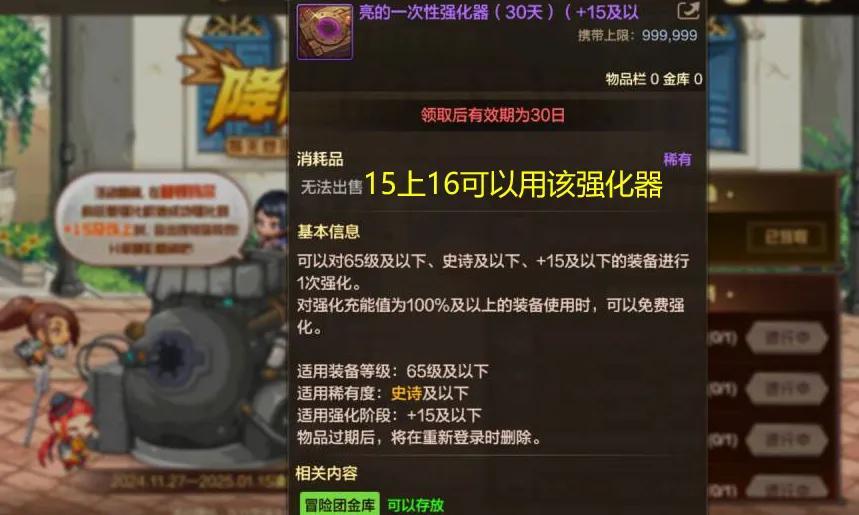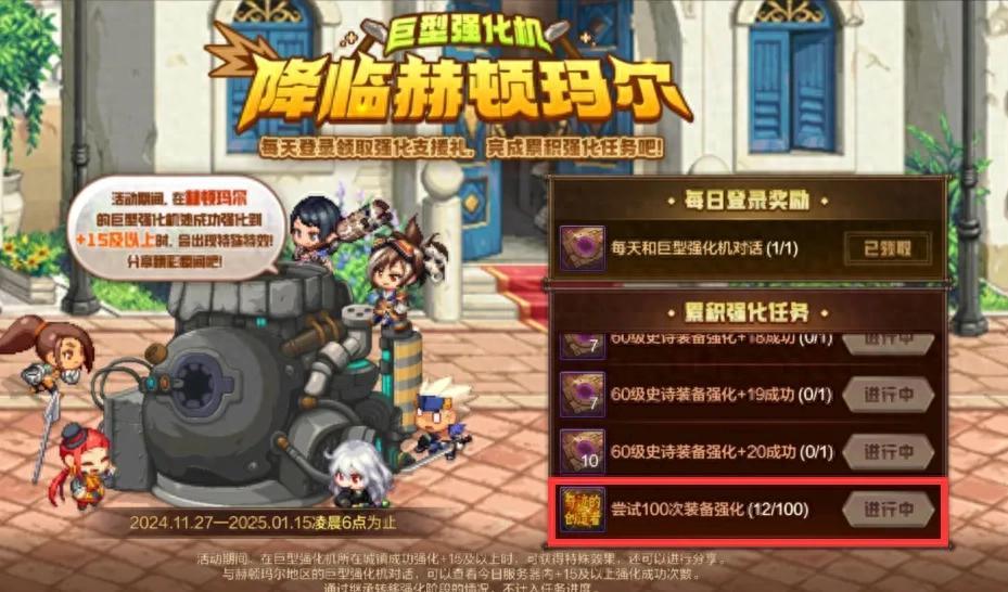 然後總結一下:11.27版上線“巨型強化機”,強化100次得稱號。強化各級裝備均可計數,強化器每日領,活動共49天。+15裝備可用強化器,累計+20得43強化器。推薦:低級裝備刷稱號,攢強化器衝15/16。