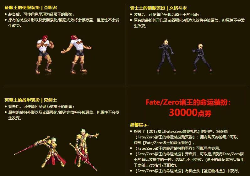 然後總結一下:Fate聯動禮包時隔11年返場,含時裝、寵物、稱號,分198清爽和259酷爽禮包,酷爽禮包多優惠券。時裝復刻並增女鬼劍Saber裝,寵物4只,稱號5種。價格較高,若下調會更受歡迎。