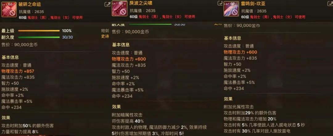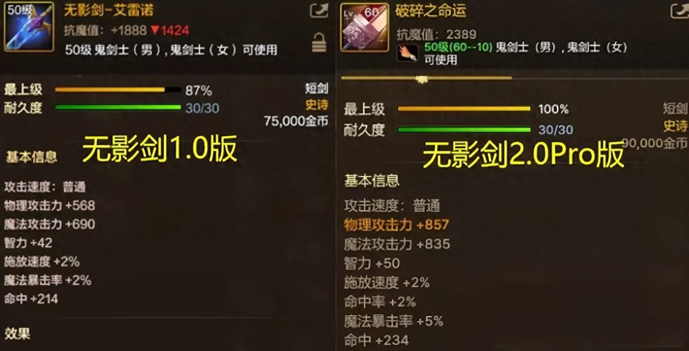 單從傷害提升率來看,顯然更推薦“破碎之命運”,這把短劍和無影劍有異曲同工之妙,