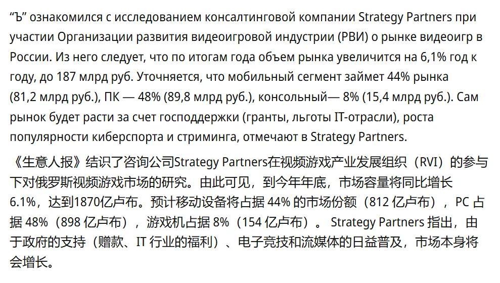 俄羅斯諮詢公司Strategy Partners 和電子遊戲產業發展組織指出,截止至2024 年底,俄羅斯電子遊戲市場規模將增長6.1%,達到1870億盧布。其中移動設備佔據44%的市場份額,PC佔據48%,而遊戲主機只能啃下剩餘的8%。