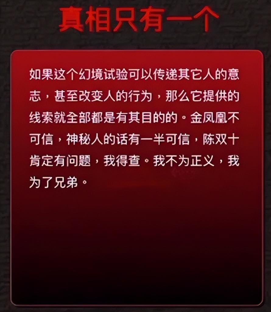 比如在《孫美琪疑案》第六季第二章節,主角南河發現了一個可以引發人物幻覺的機器“浮生若夢”,相當於又在現實層面之外疊加了一個世界。以至於接下來劇情裏,玩家再也無法憑藉既有線索推斷角色到底身處現實,還是不小心掉進了幻覺。