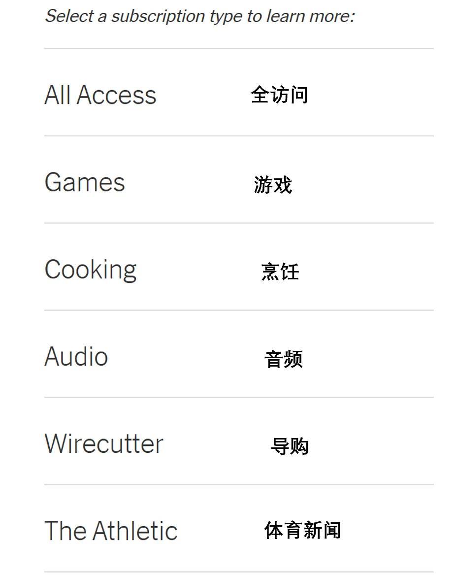 與常見的國內媒體不同,《紐約時報》網站與應用中的服務並不是免費的,需要定期付費訂閱會員才能使用,而其訂閱機制非常複雜,新聞、烹飪、音頻、遊戲等欄目各自都有獨立的訂閱服務,此外還有一個包含一切內容的“全訪問訂閱”。根據《紐約時報》2023年財報,這些訂閱收入在總營收中佔比68%,甚至遠高於傳統的廣告收入。