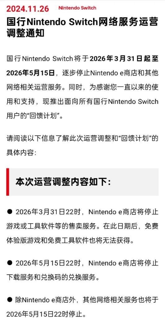 11月26日下午5時,國行Nintendo Switch發佈了一則公告,稱將於2026年3月31日起至2026年5月15日,逐步停止Nintendo e商店和其他網絡相關運營服務。