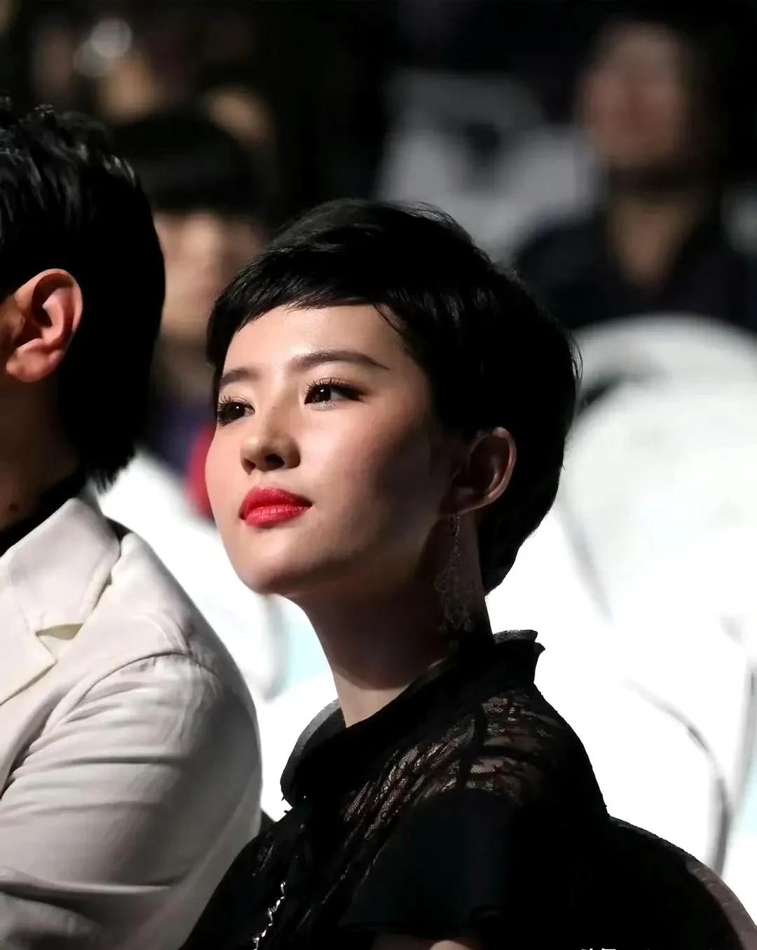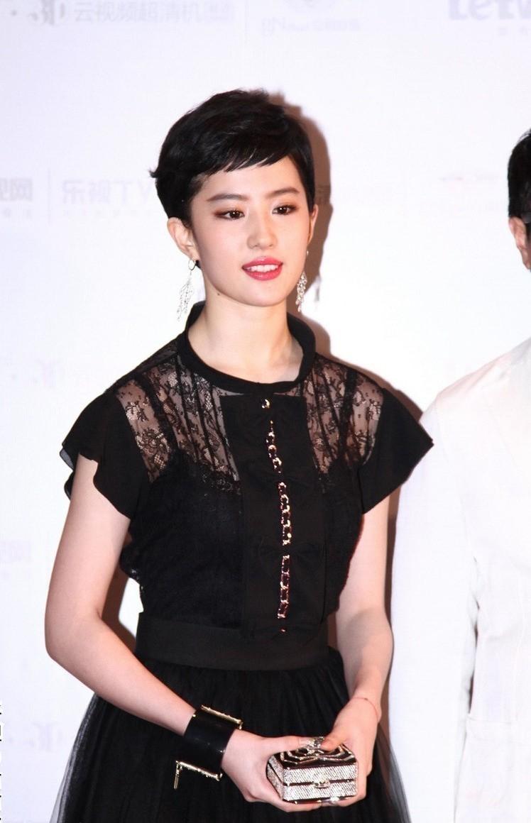 劉亦菲的臉型是屬於典型的瓜子臉,面部線條十分流暢,而且五官特別柔和,所以留長髮會比短髮更好看,但沒想到,這款齊耳短髮+眉上劉海,居然將劉亦菲的五官襯托的更精緻了,再搭配上一條黑色薄紗裙,真是時髦又英氣。