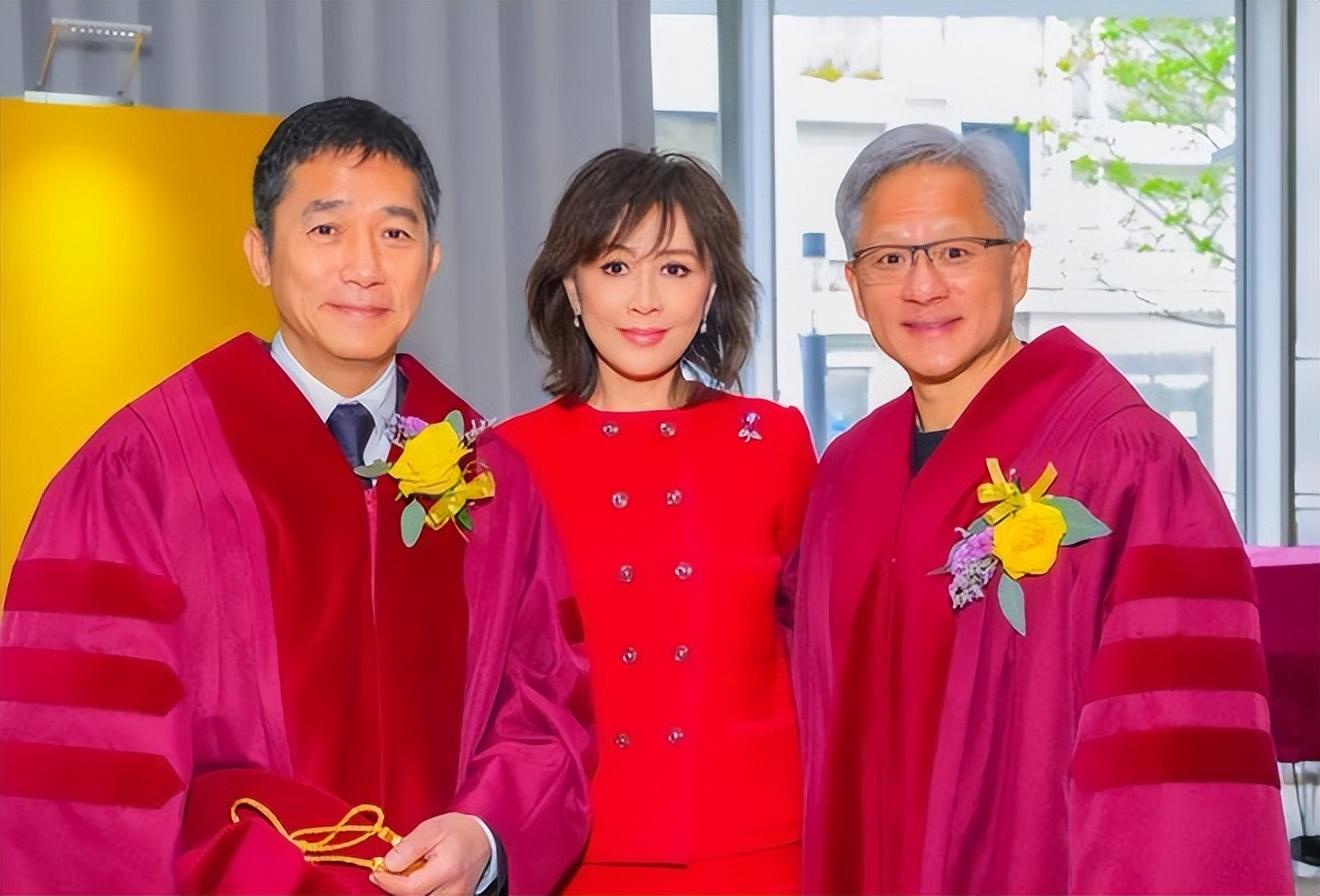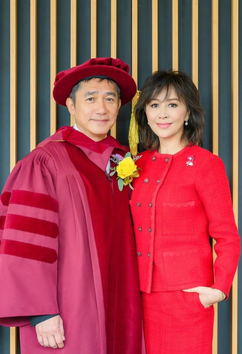 劉嘉玲和梁朝偉站在c位,兩個人穿的十分喜慶,身穿紅色博士服的梁朝偉,佩戴着紅色帽子,成功隱藏住了滿頭的白髮,擺脫了滄桑感;而劉嘉玲也穿着一身紅色的小香風套裝裙,留着短捲髮畫着精緻妝容好顯年輕。