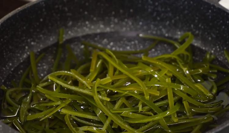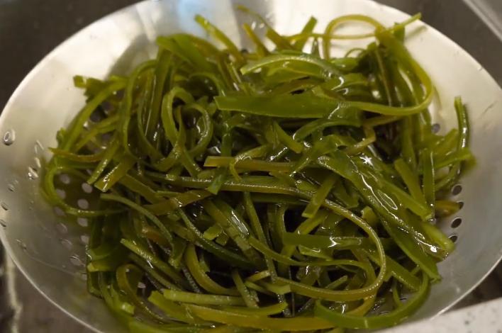 2、 撈出海帶絲過冷水瀝乾水分後備用。
