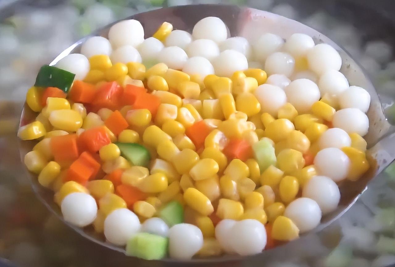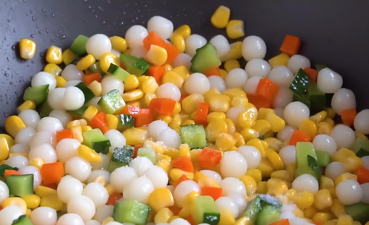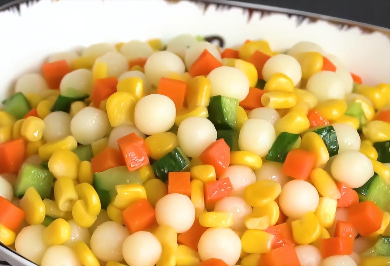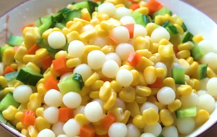 6、 燒一鍋開水,放入山藥球兒煮三分鐘,再放入黃瓜塊兒、胡蘿蔔塊兒、玉米粒兒繼續煮三分鐘,撈出後瀝乾水分備用。