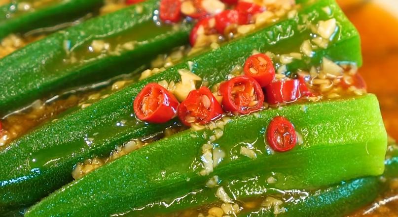 5、 將調味汁兒淋在秋葵上面完成。